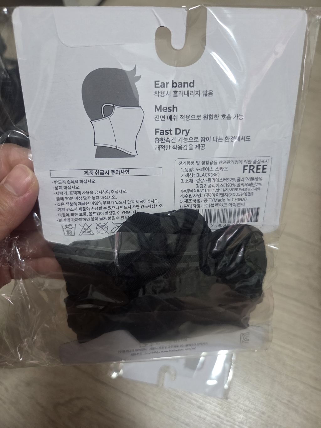 제품을 받아보니 일단 원단이 굉장히 가볍고 얇으면서도 촉감이 시원했습니다. 보통 이런 페이스스카프나 마스크형 제품은 답답하거나 숨쉬기가 힘든 경우가 많아서 걱정을 했는데, 블랙야크 제품은 냉감 소재라 그런지 착용했을 때 얼굴에 달라붙지 않고 바람이 솔솔 통해서 한여름에도 크게 불편하지 않았습니다. 귀걸이형으로 되어 있어서 마스크처럼 귀에 걸면 쉽게 고정되고, 갑자기 벗었다가 다시 착용할 때도 번거롭지 않아 상당히 편리했어요.